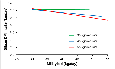 Figure 2 Relationship between milk yield and silage intake from the basal diet at three different feed rates
