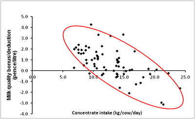 Figure 4 Effect of concentrate intake on financial payments for milk composition (bonuses or deductions; combined data for the three feed rates treatments)