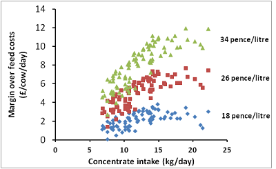 Figure 5 Relationship between concentrate intake and margin-over-feed costs for each individual cow at three different milk prices